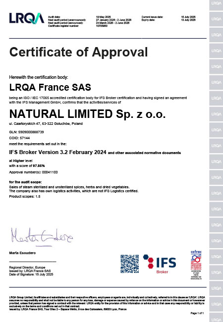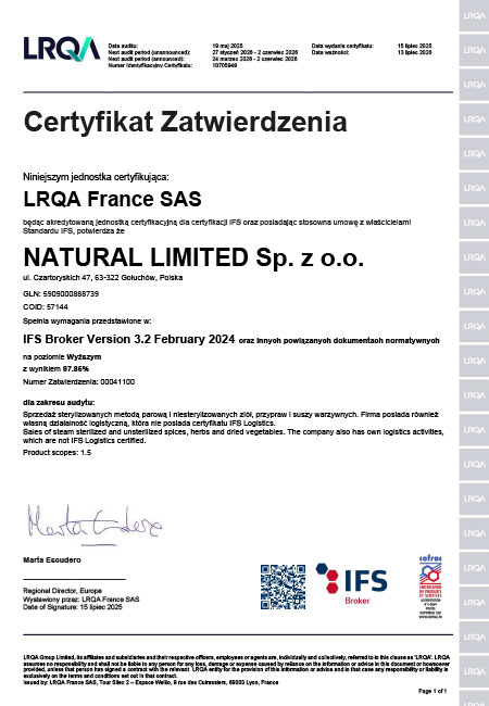 To ensure the highest standards of safety and quality, we entrust the production process to a trusted partner equipped with a modern technological line for steam cleaning and sterilization of herbs and spices. Production is carried out in accordance with the IFS FOOD Quality and Food Safety Standard, and each batch undergoes detailed microbiological and physicochemical parameter checks. This approach allows us to deliver products that meet the expectations of even the most demanding customers.